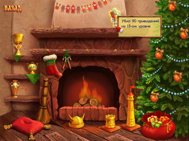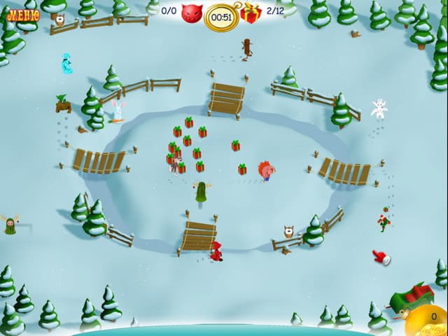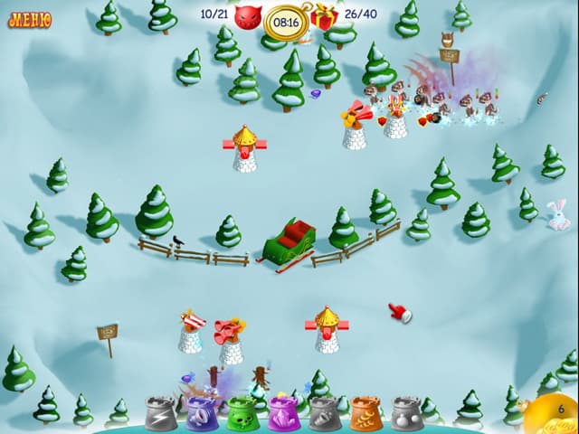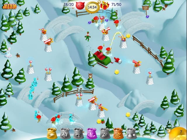 Кроме уровня «Башенки» (Tower Defense) вам предлагается уровень «Догоняшки». Его задача – провести эльфа между монстрами так, чтобы по пути он не столкнулся ни с одним из них и в целости и сохранности донес подарки до саней. Помогите детям и взрослым отпраздновать Новый год!