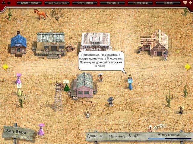 Покер по-техасски. Отправляйтесь на американский Юг, примите участие в серии представительных карточных турниров и завоюйте титул сильнейшего игрока. Поймайте за хвост свою удачу. Научитесь высокому искусству блефа, тогда вы сможете стать владельцем целой империи развлечений!